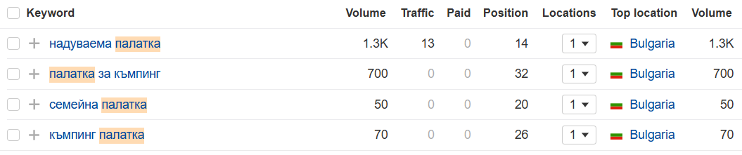 Стабилно позициониране по допълнителни думи като „семейна палатка“, „къмпинг магазин“, „двуместна палатка“